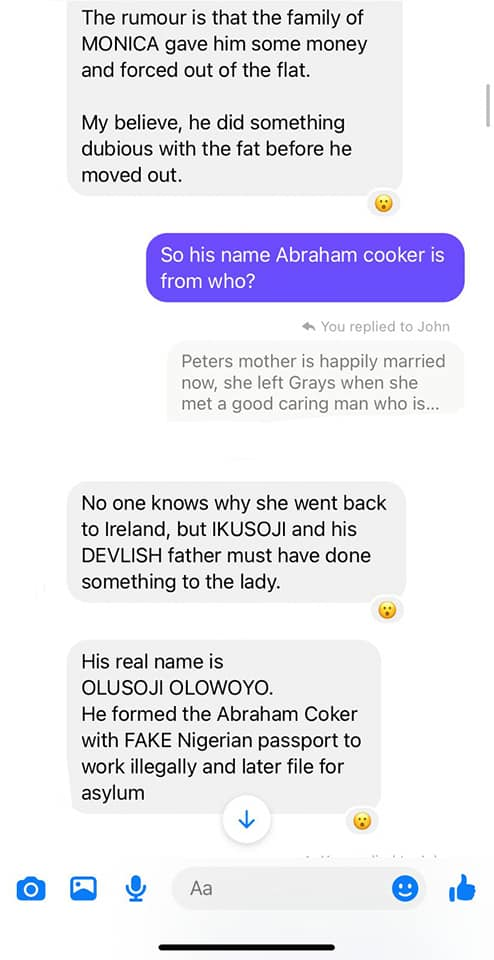 Esabod Global News reported "This is to call on the attention of the founder of Facebook, the person of Mark Zuckerberg and Meta that the above person whose picture is displayed is a Nigerian based and resides in UK with a fake document bearing the name, Abraham Coker A.K.A Soji Olowoyo with the address, Flat 35 George . Tilbury House, Goodsman Road , Grays. RM16 4TF
