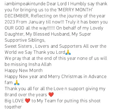 On behalf of her husband, daughter, fans, siblings, and all she expressed gratitude to her Maker as she prayed against evil before the year ended.