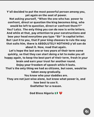 “As much as I really want to mind my business for 2024, it’s hard. It hard cos it hurts. It hurts watching the people you love and care so much about suffer, and you can’t do anything about it, because no matter how much you have or what you do, you can’t solve everybody’s problems.