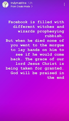 In a post on her Instagram story, she stated that Facebook is filled with different witches and wizards prophesying rubbish. Probably talking about the death of Junior Pope, she noted how no one went to the morgue to lay their hands on him when he died, yet are now prophesying.