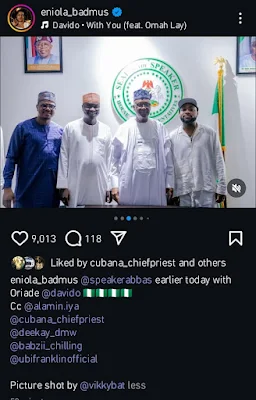 In the photos, Davido, who is currently in Abuja with his crew was captured exchanging pleasantries with the politician at his office.